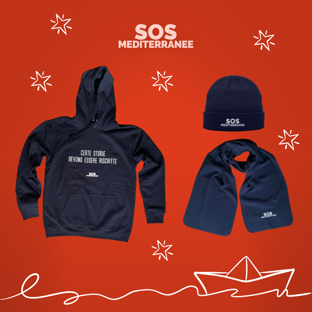 Questo kit riunisce berretto, sciarpa e felpa blu navy SOS MEDITERRANEE per accompagnarti anche nei giorni più freddi — e per ricordare che l’umanità si tiene viva, un gesto alla volta.